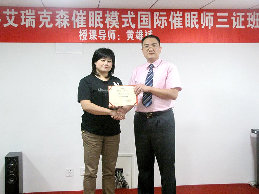 湖北丁女士,一家心理医院的精神科主任医师,专职心理咨询师,从事心理事业多年,感觉心理咨询技术有所欠缺,碰到有些复杂的个案会束手无策!为了改变这种尴尬的局面,她于2013年10月1日--10月8参加了我们的《黄氏-艾瑞克森催眠模式国际三证班》。经过8天6夜的“黄氏-艾瑞克森催眠训练”,她的人生发生了脱胎换骨的蜕变;她内心压抑多年的负面能量被一扫而空,心理能量大幅度提升,整个人变得自信满满,满载而归!同时,她也掌握了这套强大的“黄氏-艾瑞克森催眠疗法”,带回她的工作岗位,造福了很多个案。